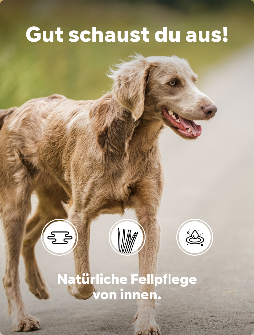 MSM (Methylsulfonylmethan) unterstützt die Bildung von Kollagen und Keratin, zwei wichtigen Strukturproteinen vom Fell. Diese Proteine sind für die Elastizität, Festigkeit und Regenerationsfähigkeit der Haut verantwortlich