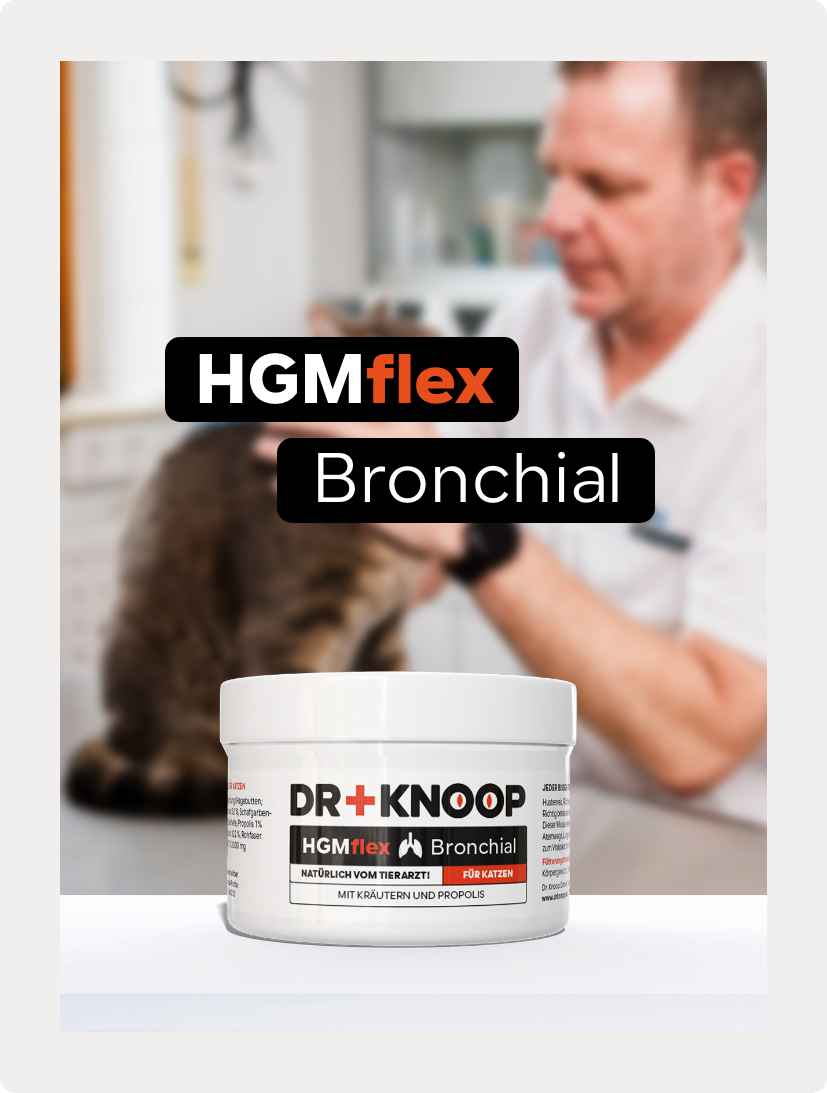 Hat dein Tier öfter mal einen „Frosch im Hals“, räuspert sich häufig und ist insgesamt verschleimt? HGMflex bronchial ist eine optimal verwertbare Mischung ausgesuchter Kräuter – empfohlen zur Unterstützung bei der Befreiung der oberen Atemwege und Bronchien von Schleim.